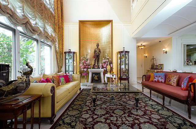 Passing through the large iron gates is a paved walkway that guides us through a quaint front garden, where Myna birds in an aviary lightly chirp a welcome. Front doors then open to an entry hall bathed in gold and beige tones and our eyes are immediately enthralled by an exquisite regal figure of His Majesty King Chulalongkorn, also known as King Rama V, towering above the mantelpiece. Not only is the striking statue a focal point of the home, but is also a fitting exemplification of the family's admiration for traditional values.