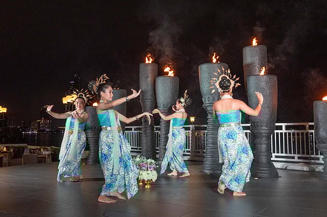 Taking up a deceptively large space right on the edge of the river, much of the restaurant sits under a capacious white marquee (much appreciated during this monsoon season), with charming paper lanterns bathing the space in a warm glow, and a stage in pride of place that can be easily seen wherever you're seated. We arrived just as the nightly performances were starting, and while the aromas of freshly-cooked barbecued meats and seafood were tempting, we couldn't take our eyes off the spectacle unfolding in front of us. From graceful dancers in different traditional Thai attire, to exhilarating fire shows, and even a fashion show, this part of the evening is definitely one not to be missed, so make sure you arrive before 7pm.