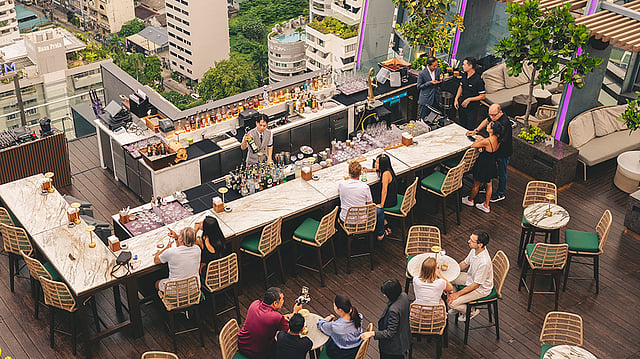 The style and elegance, spanning three separate floors, were designed by the renowned Japanese design firm Super Potato, creating a warm, welcoming, and relaxing ambiance. Complemented by various Thai art pieces, musical instruments, and intimate lighting, the lounge and bar on the 29th floor are inspired by modern-day metropolitan penthouses. The residential-style space is incredibly versatile, going beyond the usual dining experience. By day, it can serve as an event lounge, ideal for meetings, product launches, and even smaller wedding events. During evenings, the space transforms into a Bond-like venue for live music, stylish drinks, and delicious food.
