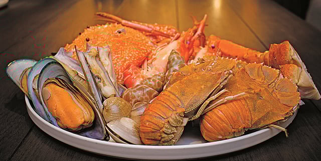 Always popular with the brunch crowd is the Seafood on ice, taking centre stage in the café's main dining hall, with three lavish ice trays filled with squid, mussels, blue crab, king crab, rock lobster, shrimp and river prawn, alongside five oyster varieties. Just behind lies the foie gras station, where you can pamper your taste buds with an unlimited fl ow of the buttery French delicacy. Situated close by, and tempting us with the unmistakable aromas of cream and cheese, is the pasta corner, where the Italian staple is made fresh-to-order and can be customised with various toppings. For those who love their pasta extra cheesy, the bacon and mushroom carbonara gets a luxurious bath in the parmesan cheese wheel, before being placed into your waiting hands.