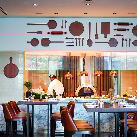 Perched on the second floor of Sofitel Bangkok Sukhumvit, Bella Sera greets you with soothing palettes and cheery patterns, from the gingham tablecloths to the chevron backrests on their couches; encapsulating the relaxed atmosphere of an Italian bistro. With views of the lobby's spectacular crystal chandelier right across from its open kitchen, replete with a wood-fired pizza oven and brushed brass lighting; the space is at once cosy and welcoming, yet luxe. The eye – or at least, my eye in particular – was immediately drawn towards their temperature-controlled wine cellar, not-so-hidden behind glass doors that tempt you with the array of premium labels that lie within.