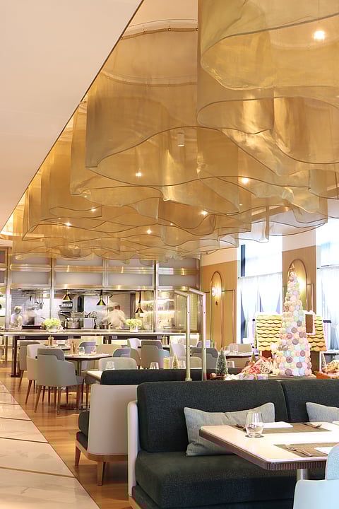 Pushing through the doors of Weaver feels like entering an ode to interior design. Blonde wood walls and polished wooden floors radiate comfort, while circular light fixtures cast a soft warm glow, creating an intimate and refined atmosphere. The restaurant's golden wav like ceiling is an eye-catching centrepiece, mirroring the undulating patterns found in the doors and adding fluidity to the space. Abstract art pieces adorn the walls next to depictions of ancient Chinese sewing techniques, and a topographical map of Asia. As you take your seat, you will notice that the dining tables are a statement by themselves: marble tops supported by dark oakwood bases, exuding timeless quality. Even the salt and pepper shakers are made from wood, echoing the design's natural elements.